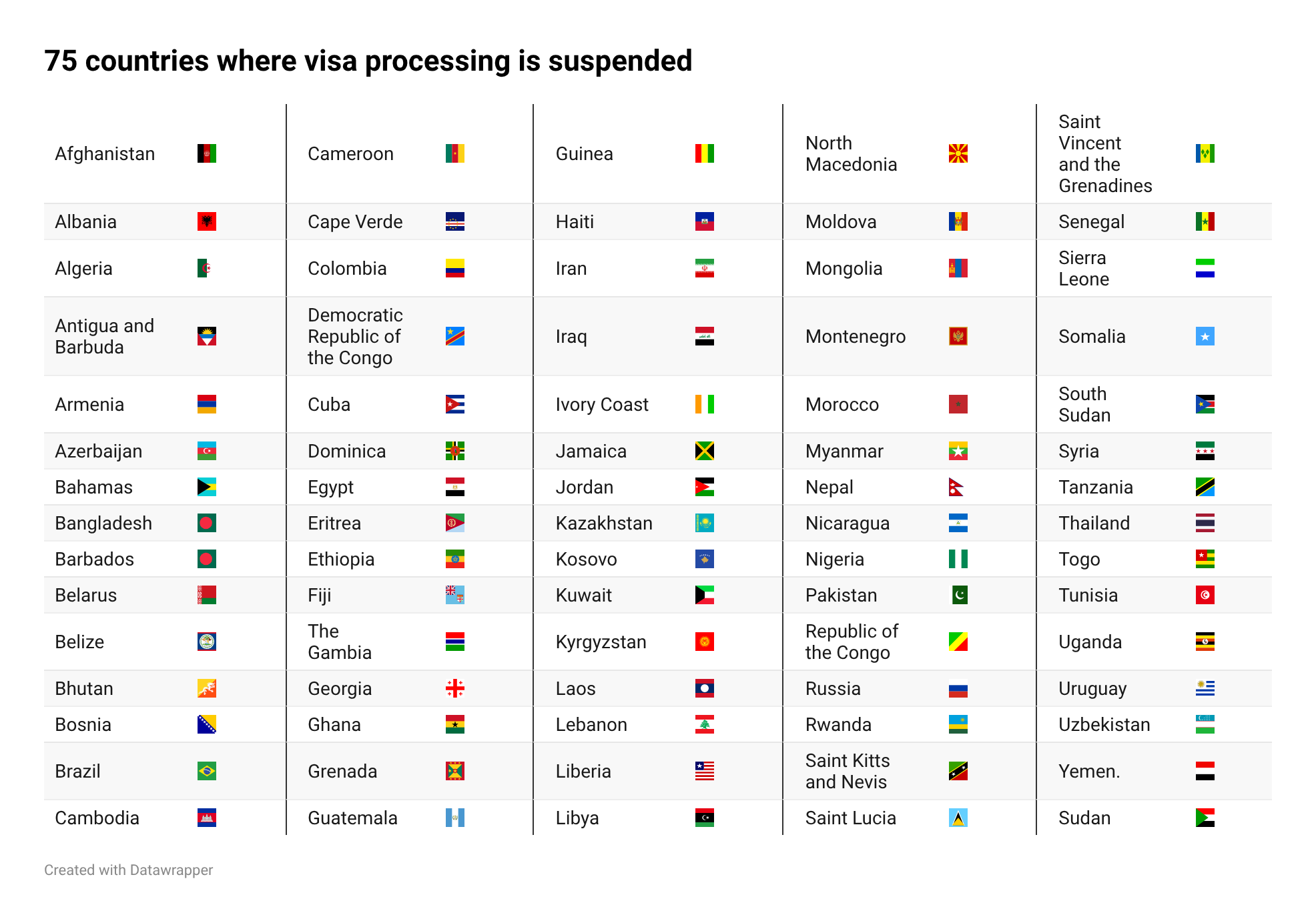 - The pause comes on top of the travel ban imposed on 40 countries in June 2025 which included Afghanistan, Congo, Eritrea, Haiti, Iran, Libya, Myanmar, Somalia, Sudan and Yemen – also on the 2026 visa suspension.