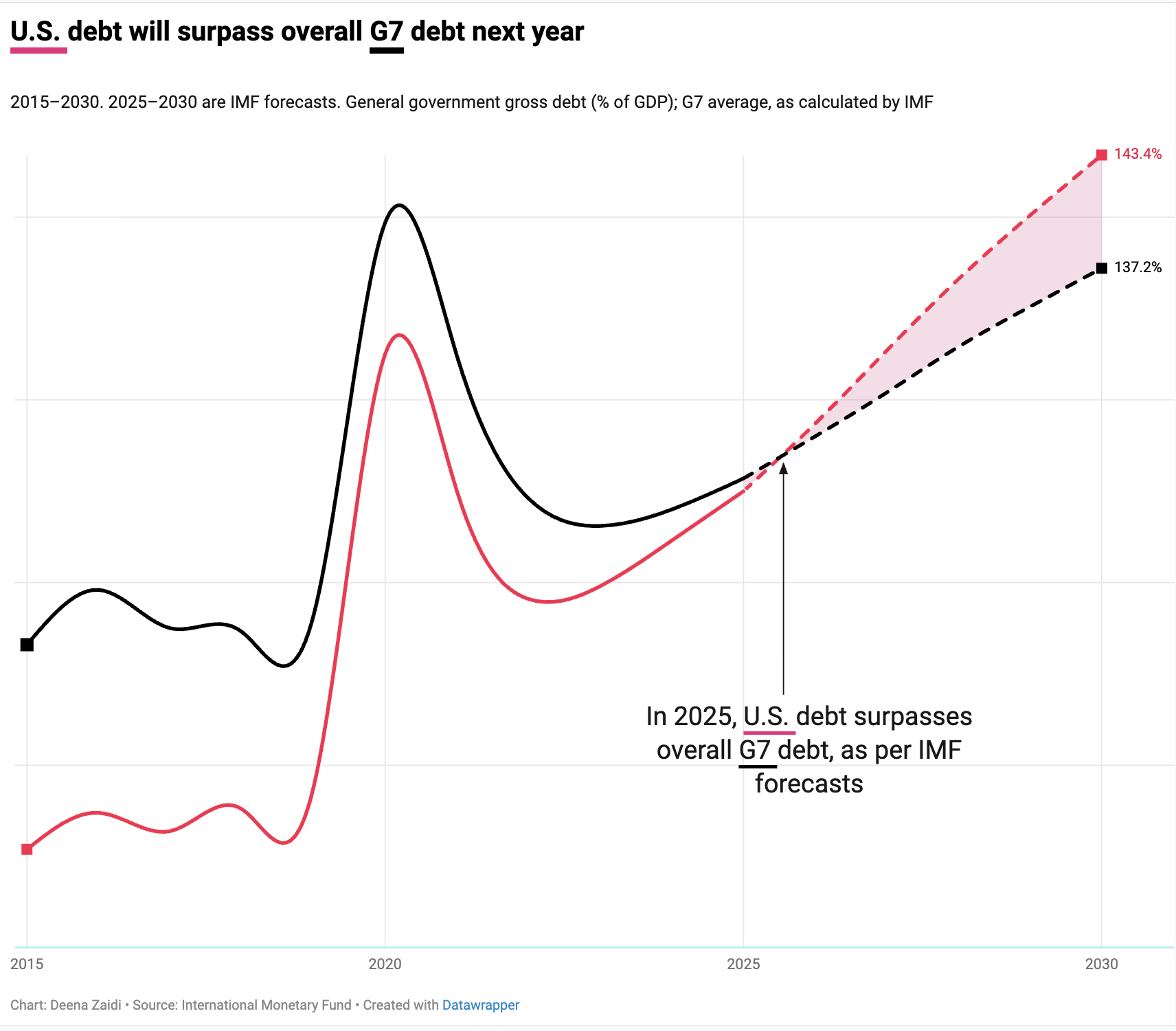 • According to IMF World Economic Outlook projections, U.S. debt climbs from around 120–125% of GDP in the early 2020s to about 143.4% of GDP by 2030 under current policies- the steepest increase among G7 economies over this period.